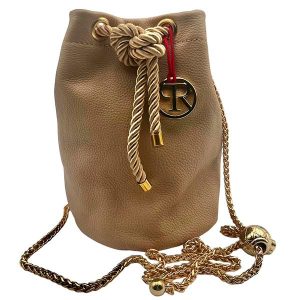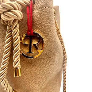 Bolso en piel de vacuno en tono champán con 2 asas y bolsillo interior, lleva 1 cordón marrón de lurex. Efecto desgastado en las asas.