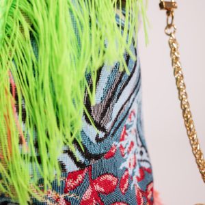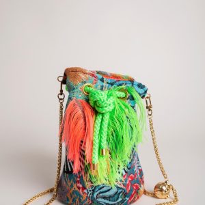 Bolso saco mini en tela con flecos flúor. Lleva cordón verde flúor y cadena dorada regulable.