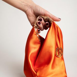 Bolso mini estilo pañuelo satinado naranja. Lleva mango en piel xde vacuno con print de pitón en crudo y marrón.