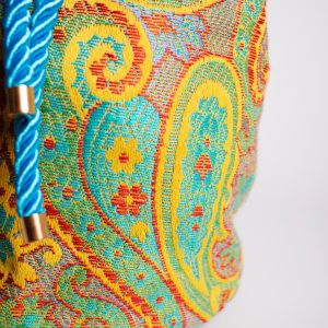 Bolso saco con 2 asas y bolsillo interior. Lleva cordón satinado turquesa