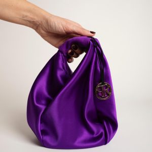 Bolso mini estilo pañuelo en satinado morado. Lleva mango en piel de cabra morado.