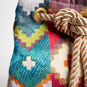 Bolso saco mini en tela con motivo étnico. Lleva cordón satinado beige y asa de lona regulable.
